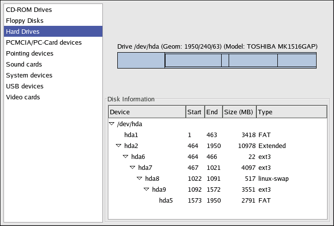 Select Hard Drives from the panel and find your Windows partition from the Disk Information displayed. Windows partitions normally use the FAT or FAT32 file system type. This file system type can be mounted and read within Linux; however, if your Windows partition uses NTFS, then you cannot mount and read from it as Red Hat Enterprise Linux does not support NTFS file systems. Note the Device information for your Windows partition, as this is the device that you mount to access your Windows data.