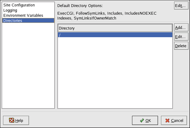 Click the Edit button in the top right-hand corner to configure the Default Directory Options for all directories that are not specified in the Directory list below it. The options that you choose are listed as the Options directive within the <Directory> directive. You can configure the following options: