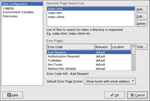 Use the Error Code section to configure Apache HTTP Server to redirect the client to a local or external URL in the event of a problem or error. This option corresponds to the ErrorDocument directive. If a problem or error occurs when a client tries to connect to the Apache HTTP Server, the default action is to display the short error message shown in the Error Code column. To override this default configuration, select the error code and click the Edit button. Choose Default to display the default short error message. Choose URL to redirect the client to an external URL and enter a complete URL including the http:// in the Location field. Choose File to redirect the client to an internal URL and enter a file location under the document root for the Web server. The location must begin the a slash (/) and be relative to the Document Root.
