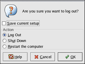 When the confirmation dialog appears as shown in Figure 1-15, select the Logout option and click the Yes button. To save the configuration of your desktop, as well as any programs which are running, check the Save current setup option.