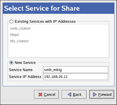 Enter a Service IP Address — Clients access file shares from a server as designated by its IP address (or associated hostname). To abstract clients from knowing which specific cluster member is the acting Samba server, the client systems should not use the cluster member's hostname as the IP address by which a service is accessed. Rather, clustered Samba services are assigned floating IP addresses which are distinct from the cluster server's IP addresses. This floating IP address is then configured on which ever cluster member is actively serving the share. Following this approach, the clients are only aware of the floating IP address and are unaware of the fact that clustered Samba services have been deployed.