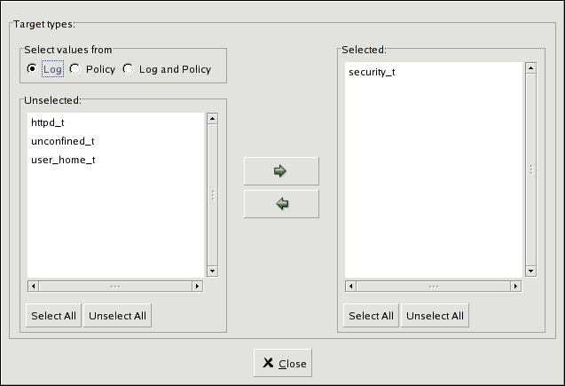 Figure 6-4. seaudit Editing Filters Select Target Types Window